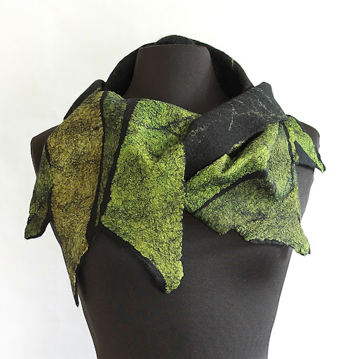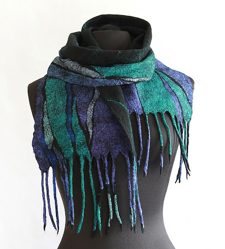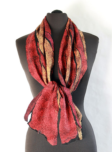 In this workshop you will learn techniques for creating an extremely lightweight yet well felted nunofelt scarf. We’ll use two layers of silk hankies and two layers of silk fabrics to create different marble designs on the two sides. You’ll be challenged to lay the superfine merino wool extremely thin to create a drapey and featherlight fabric. Fringes are optional on the scarf. We’ll significantly reduce the rolling time by applying the “dryer method”.