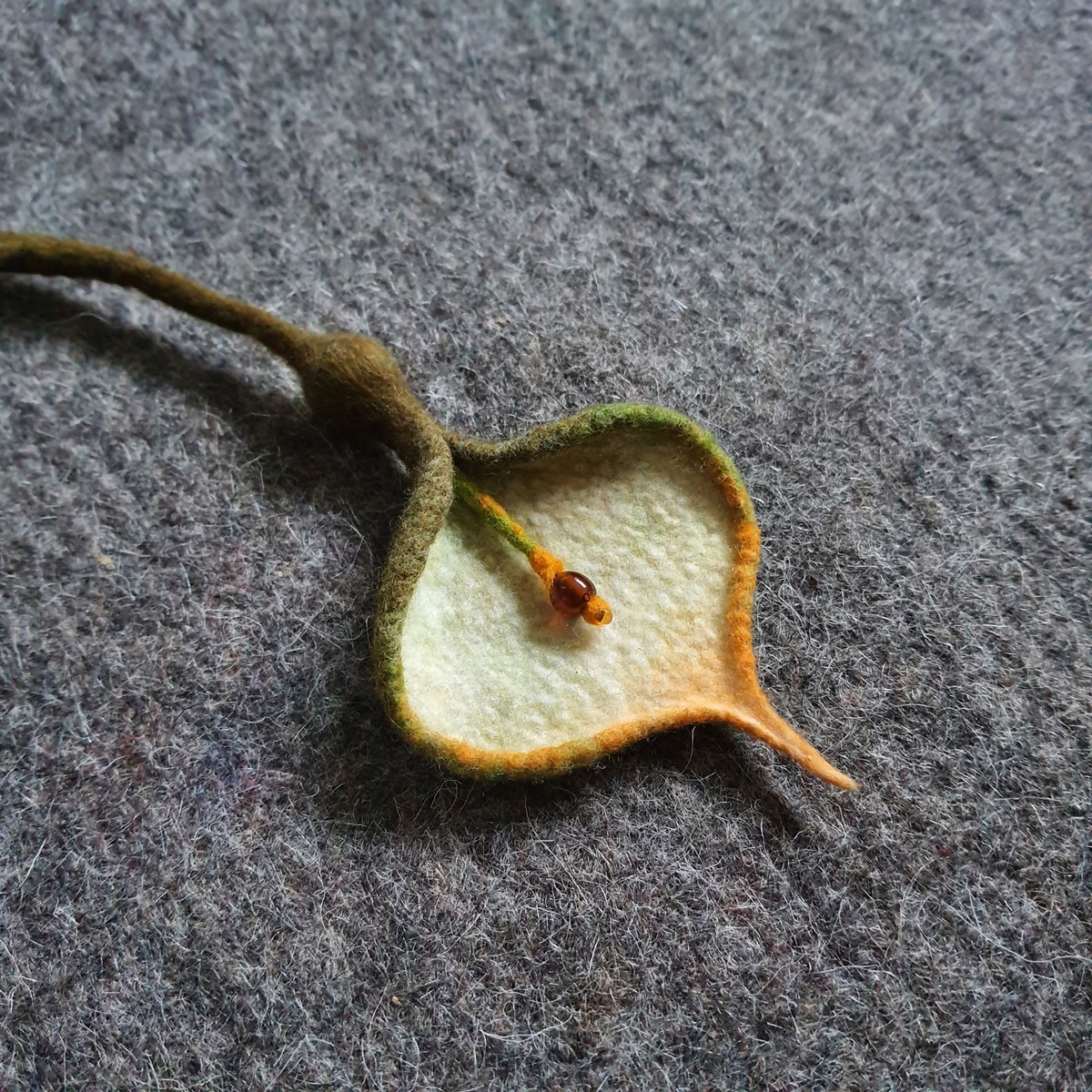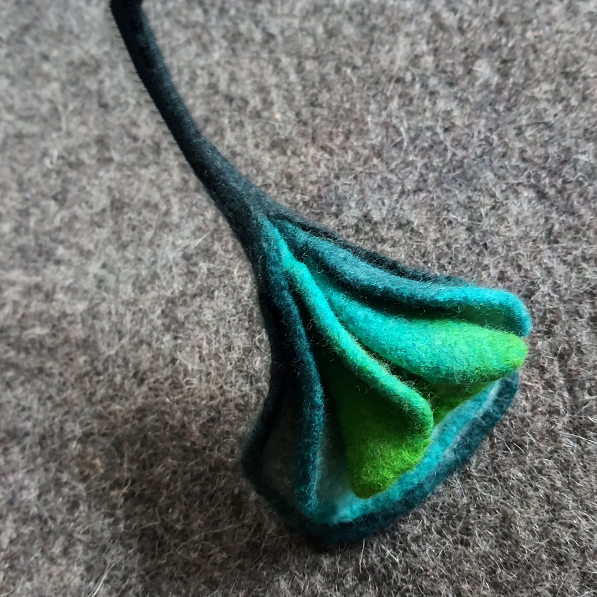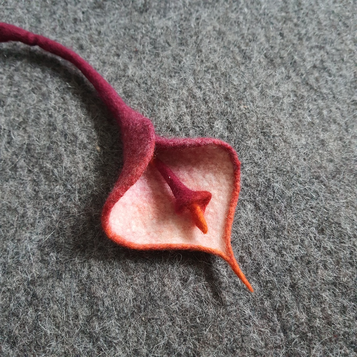 In this class I will guide you to create complex 3D shapes inspired by nature. You’ll master a very thin layout with smooth color blending to create a pearlescent, featherweight Calla Lily shaped pendant. We’ll make the cord of a necklace first, and then attach the segments by constructing and felting the parts together.