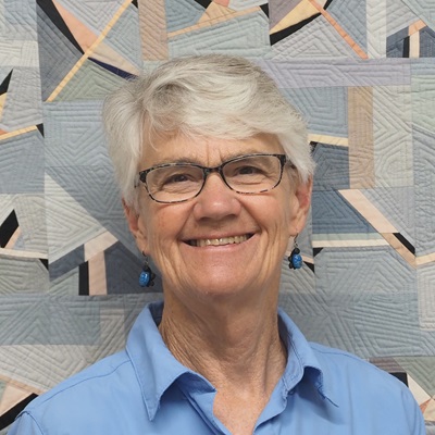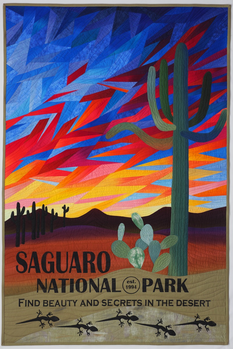 Vicki Conley lives in the mountains of southern New Mexico. She has been a creative person all her life and has recently retired from 42 years as a studio potter. She has been a fiber artist for about 20 years and is now also exploring surface pattern design and online teaching. Her work has been exhibited nationally and internationally and was part of Quilt National 2017. Vicki has an eye for interpreting the natural world and is best known for her original national park poster art quilts. She and her husband now travel extensively in their RV with their two dogs, always looking for the next inspiration. Vicki enjoys bold graphic landscapes as well as abstract improvisational piecing.