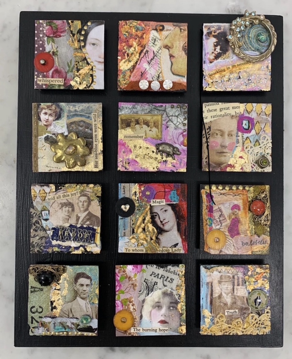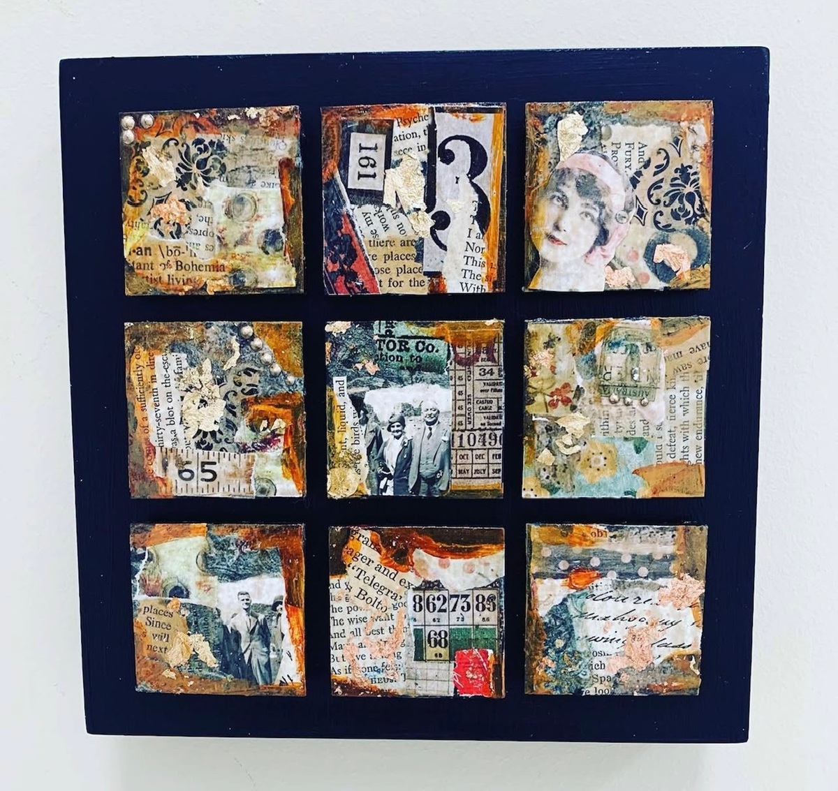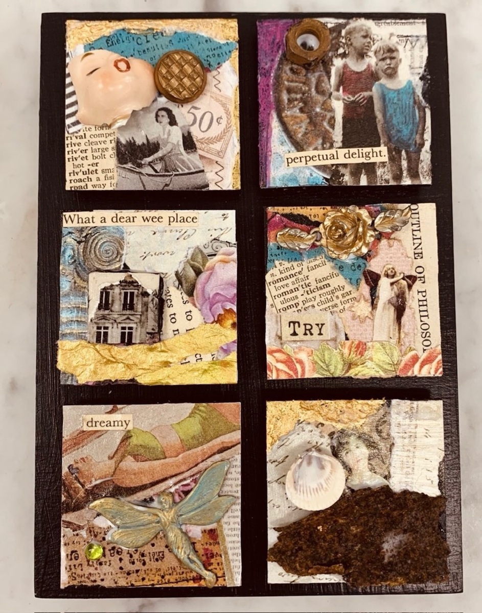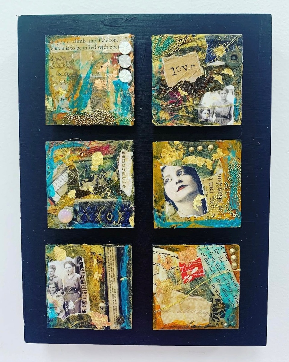 If you love to collage or have always been drawn to collage art, this is the workshop for you. Using small (2.5”) wood substrate squares, we’ll make several mini collages using magazine clippings, text from old books, rhinestones, photos and anything else your imagination comes up with. Once these are completed, we’ll arrange them on the substrate of your choosing. Each mini collage is a work of art and when arranged together you’ll take home a beautiful piece of meaningful artwork.