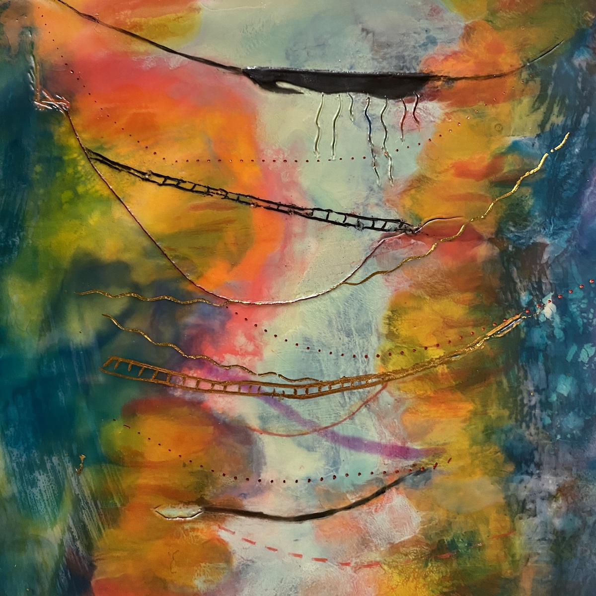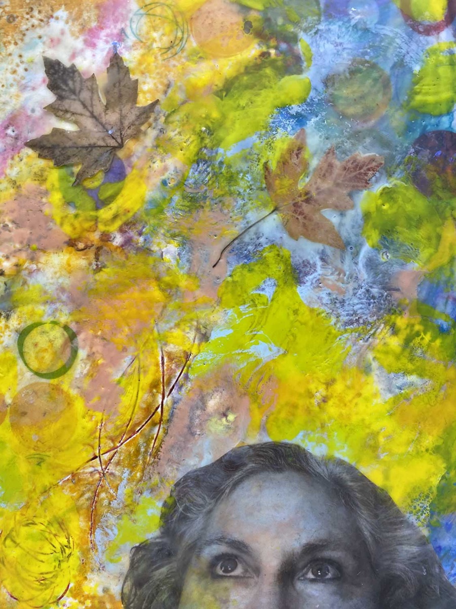 We’ll collage with wax instead of glue to incorporate papers (including photos!), fabrics, and threads. I’ll share my technique for creating collage materials embellished with my favorite “instant stamps” that you’ll create during class, using impressions from natural materials and everyday objects. Encaustic paint can also be paired with a wide variety of materials including pastels, graphite, and artist crayons so there will be time for you to explore those too.