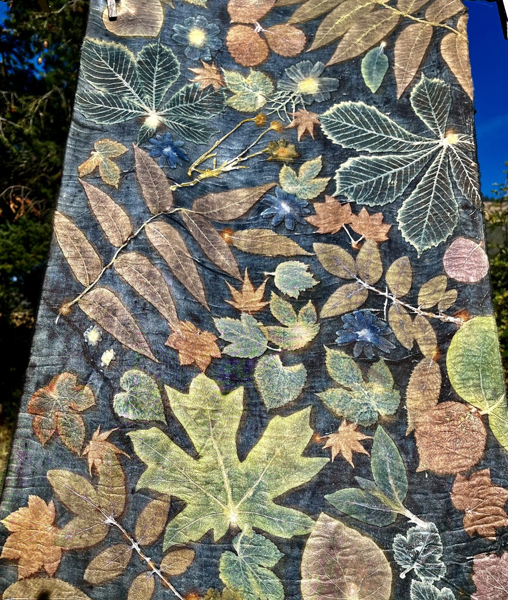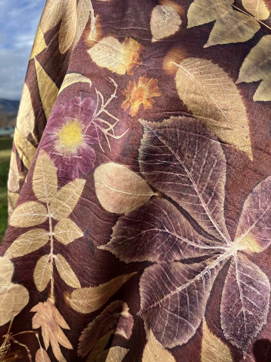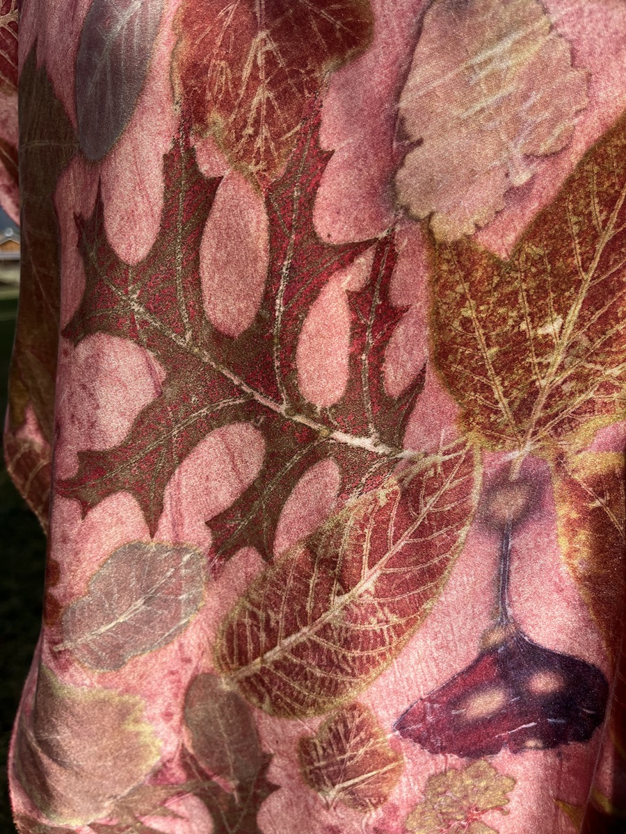 In this 3-day workshop you will learn the many facets of printing with leaves and other botanicals, as well as how to combine these prints with natural dyes to create richly colored art-to-wear scarves, yardage, garments, or wall art. We will be working with protein fibers- wool and silk, primarily different types of silk such as charmeuse, raw silk, tussah and eri silk.