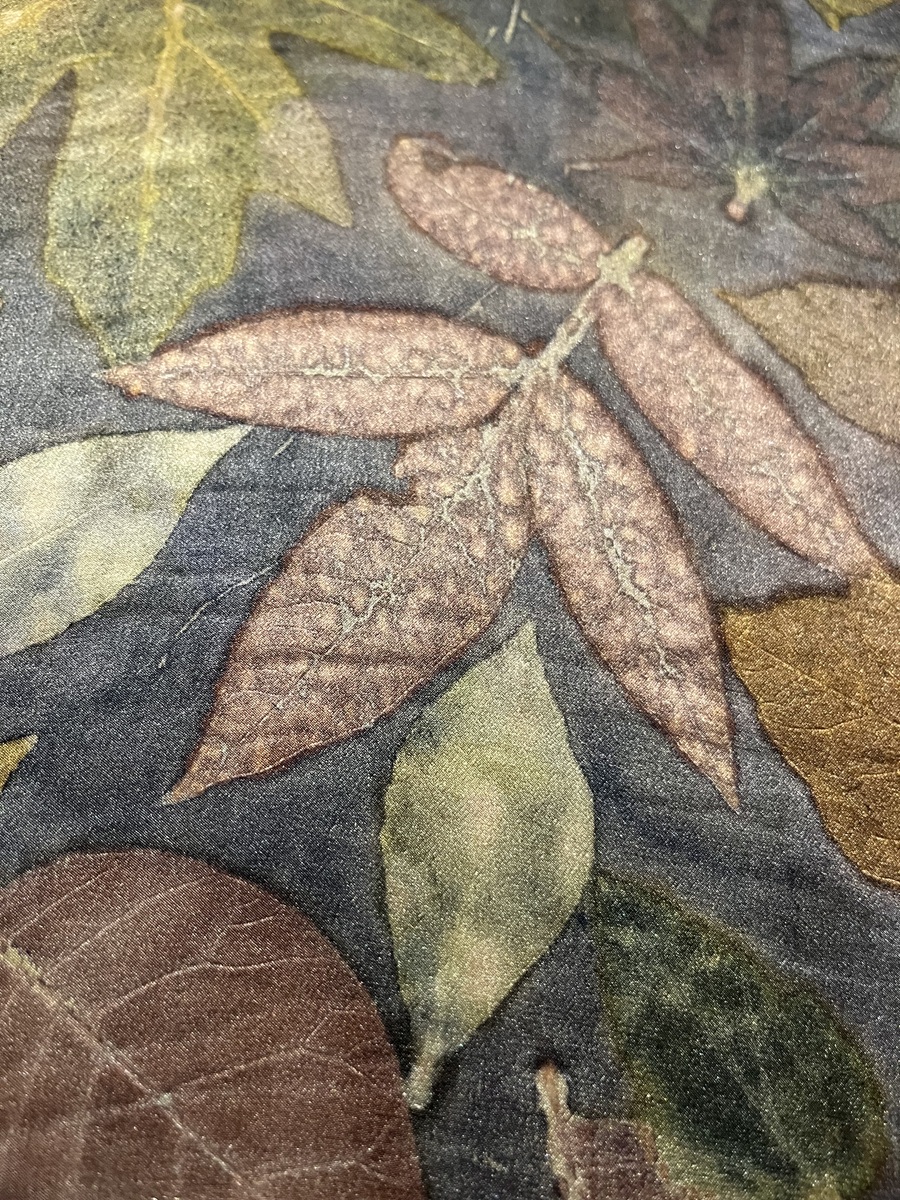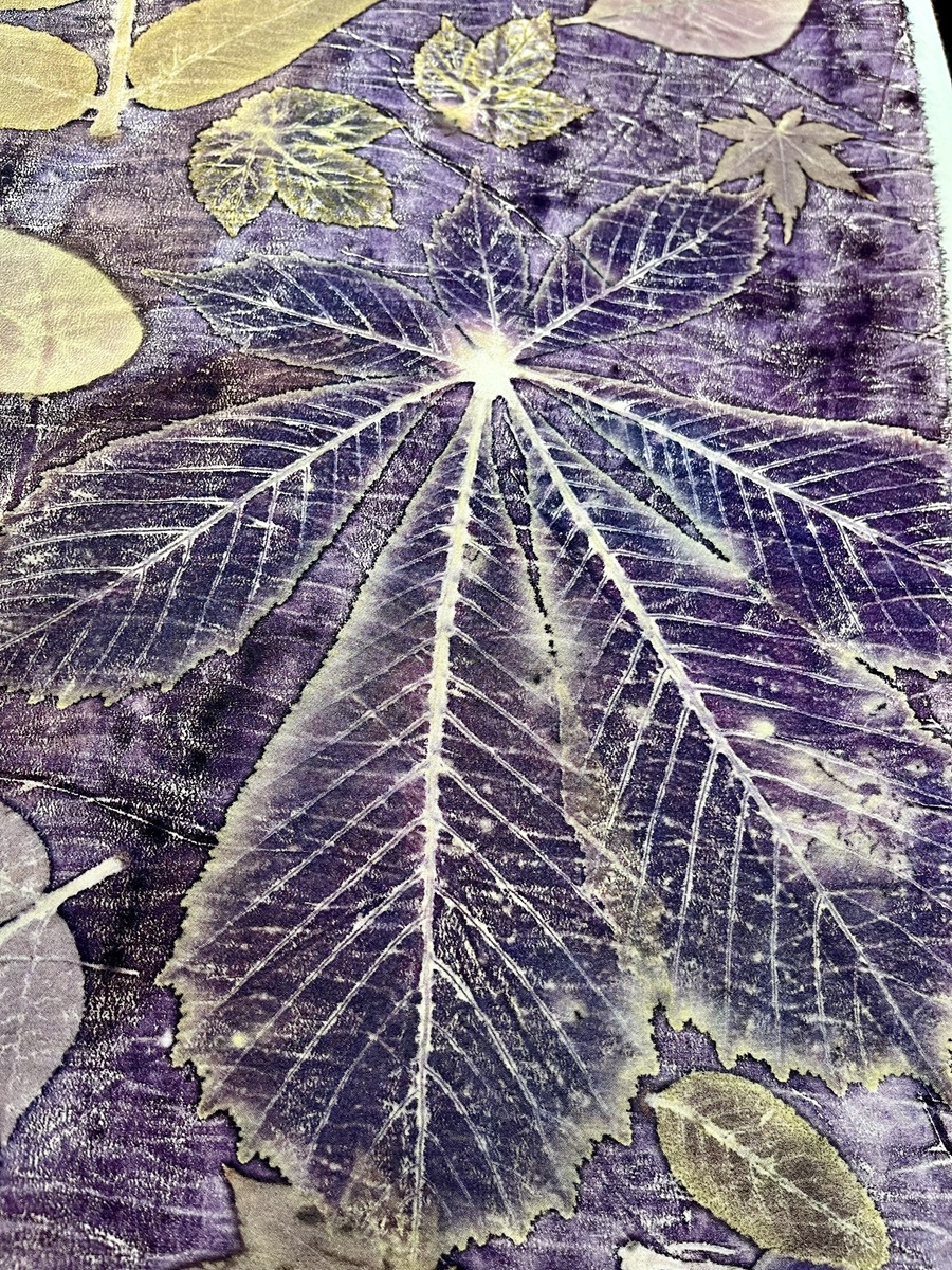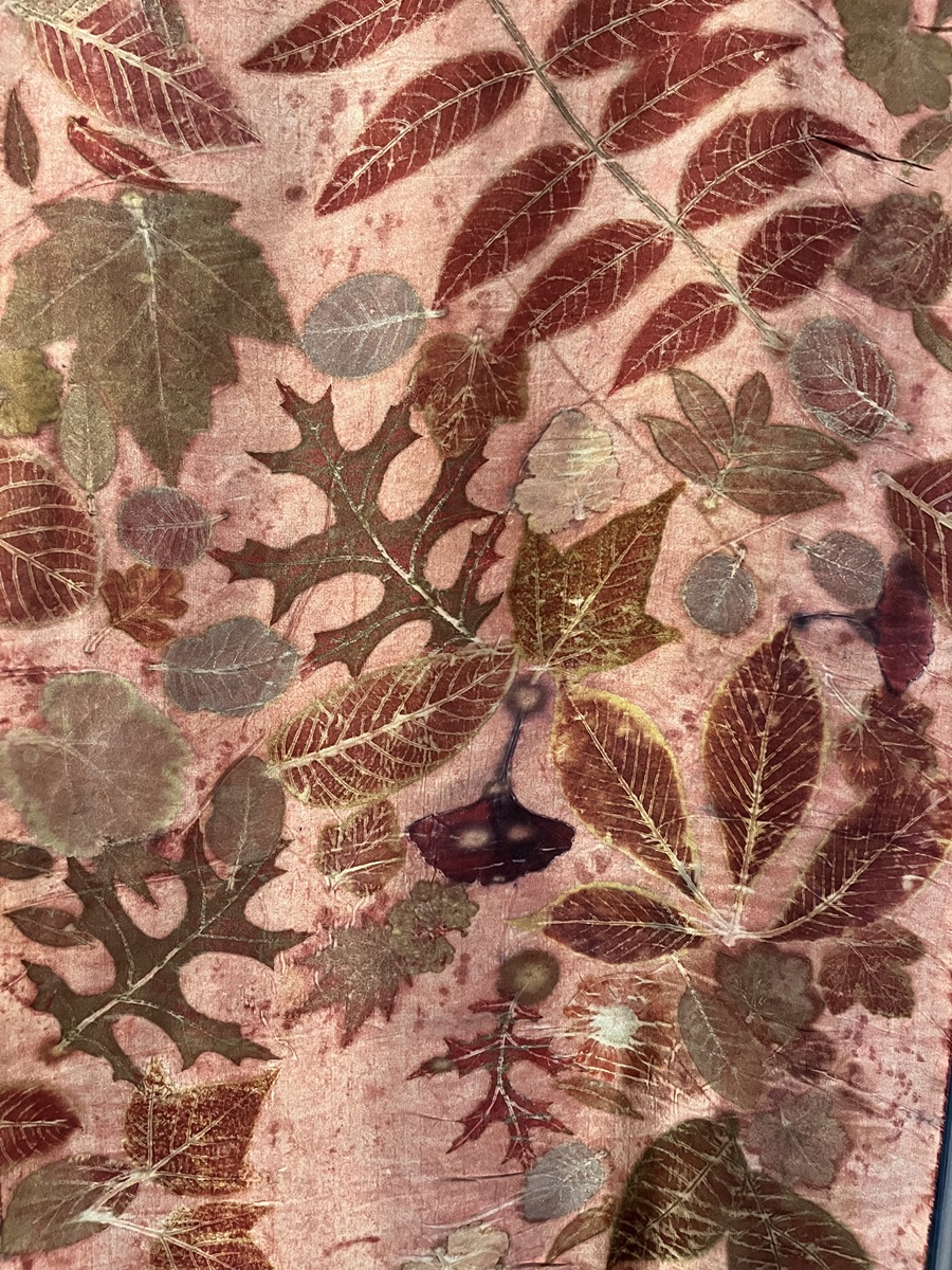 In this 3-day workshop you will learn the many facets of printing with leaves and other botanicals, as well as how to combine these prints with natural dyes to create richly colored art-to-wear scarves, yardage, garments, or wall art. We will be working with protein fibers- wool and silk, primarily different types of silk such as charmeuse, raw silk, tussah and eri silk.