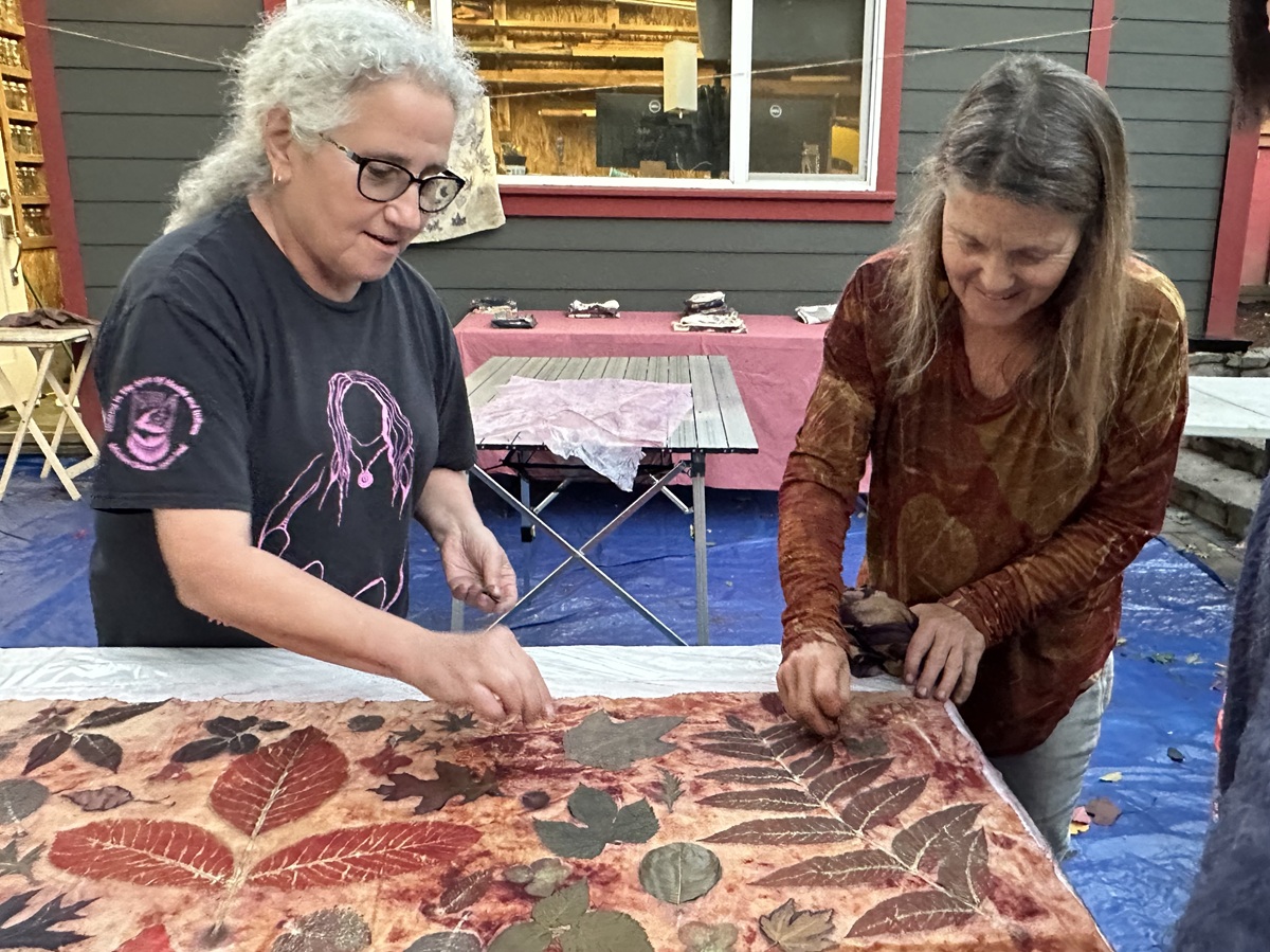 You will learn the importance of how to properly prepare the cloth for dyeing- an important part of the process. Proper scouring and mordanting for each type of cloth will be taught. Mordants are soluble metal salts which, when combined with natural dyes and the botanicals infuse the colors and prints of leaves into the fiber. These are permanent and will not wash out.