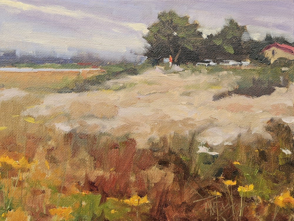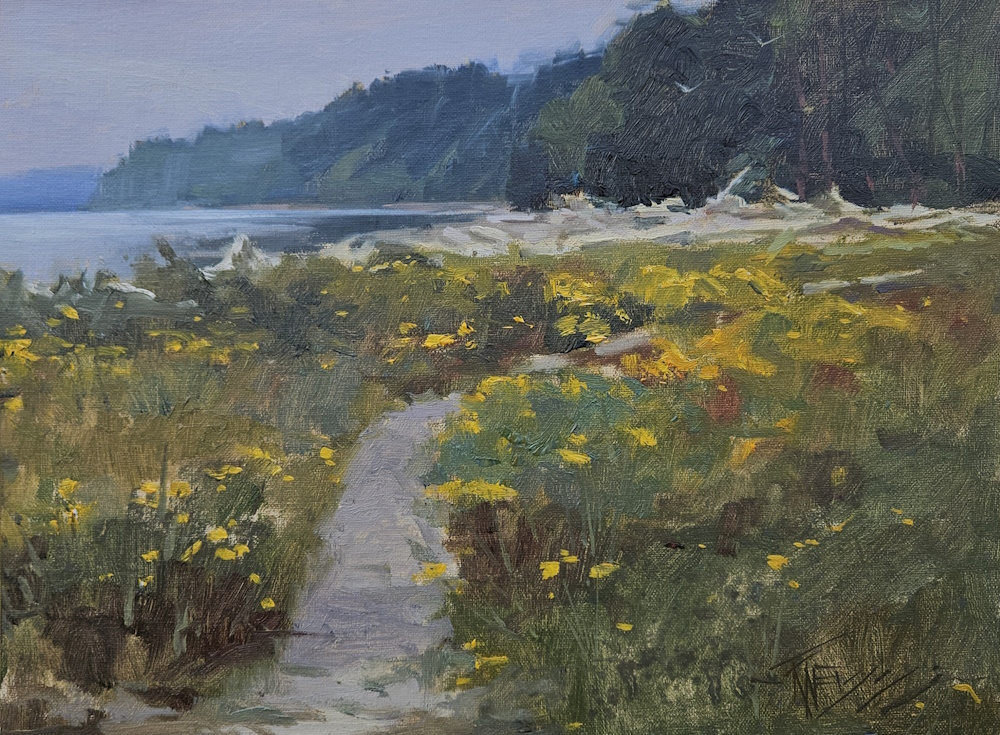 We will meet at the Pacific NorthWest Art School in the morning to go over subjects listed above and then drive to a location, probably Coupeville or Ebey’s Landing. There will be some walking with gear so you will need a portable easel and some thing to carry your stuff. My pochade and all I need to paint fits in a Kelty 65 back pack. Students in the past who do not have portable pocahde boxes have used a French easel and some type of cart to move gear into the field.
